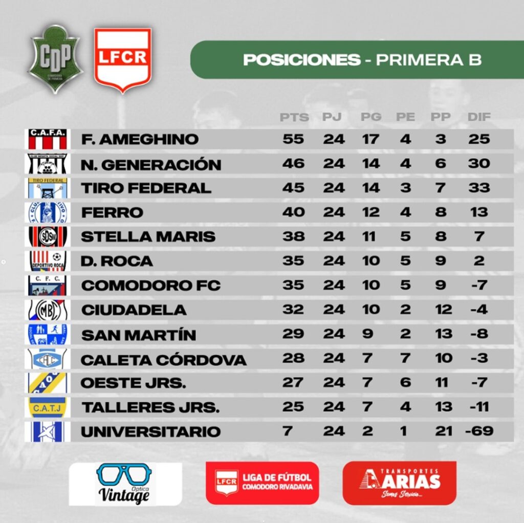 En cancha de Ferro, se completó la fecha 26 de la Primera B, última jornada del Torneo Apertura, Ameghino empató 1 a 1 contra Nueva Generación, éste último con la igualdad se aseguró el segundo puesto superando a Tiro Federal por un sólo punto.