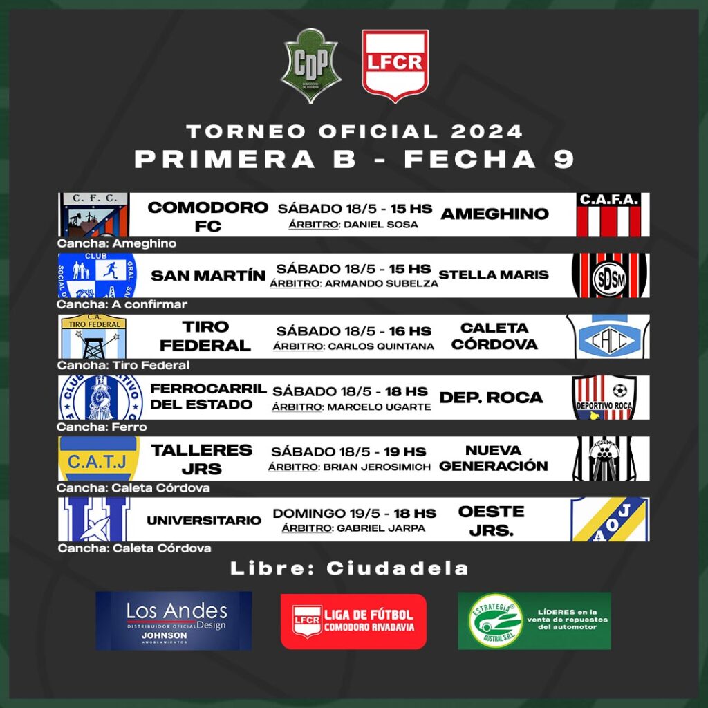 A las 16, Tiro Federal recibe en su césped sintético a Caleta Córdova en un interesante duelo, el juez designado es Carlos Quintana, con los asistentes Diego Schoff y Cristian Raimilla.