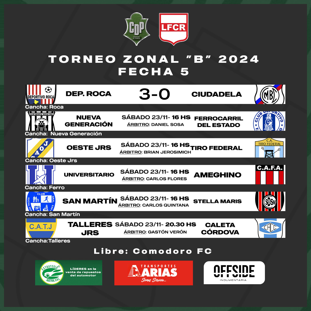 La jornada comenzó este viernes por la noche, cuando el Deportivo Roca venció como local por 3 a 0 a Ciudadela, concretando su primera victoria en este Zonal, luego de 2 empates y 2 derrotas.