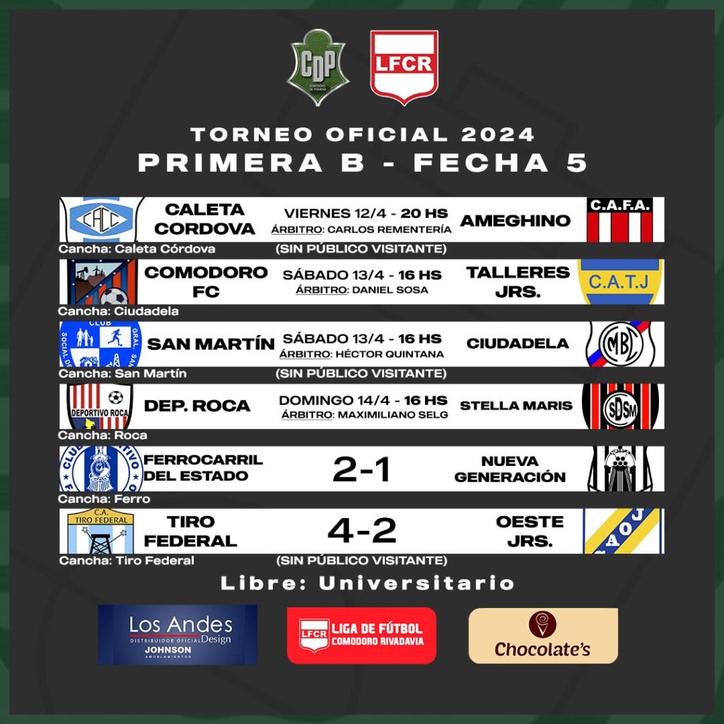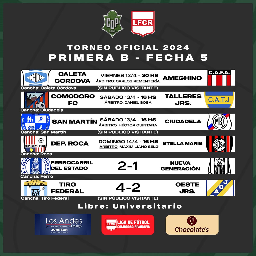 El día viernes habrá un sólo partido, el cual es clave, porque Florentino Ameghino buscará ganar para alcanzar la punta, visita a Caleta Córdova en el Puerto, y este encuentro se disputará en horario nocturno, a partir de las 20 horas con el arbitraje del señor Carlos Rementería, acompañado por Marcelo Ugarte e Iván Peña.