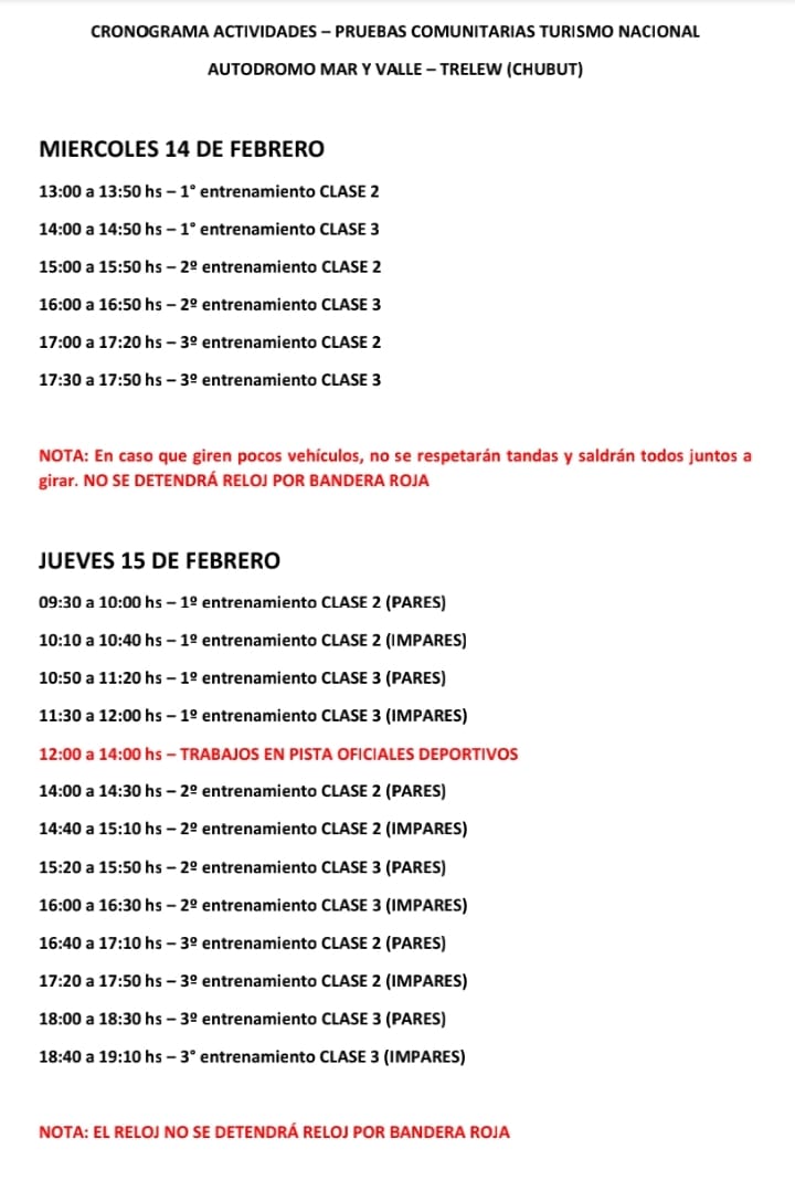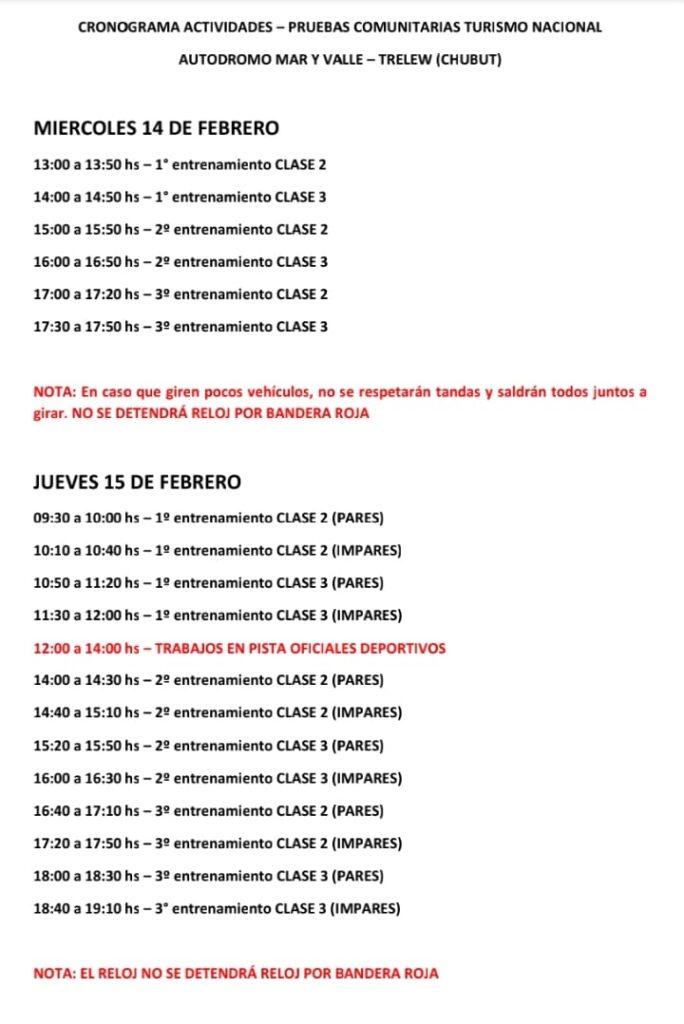 En el Autódromo Mar y Valle de Trelew, los días miércoles 14 y jueves 15 de febrero, se realizarán pruebas comunitarias previas al inicio del Campeonato 2024 de Turismo Nacional Clase 2 y Clase 3.