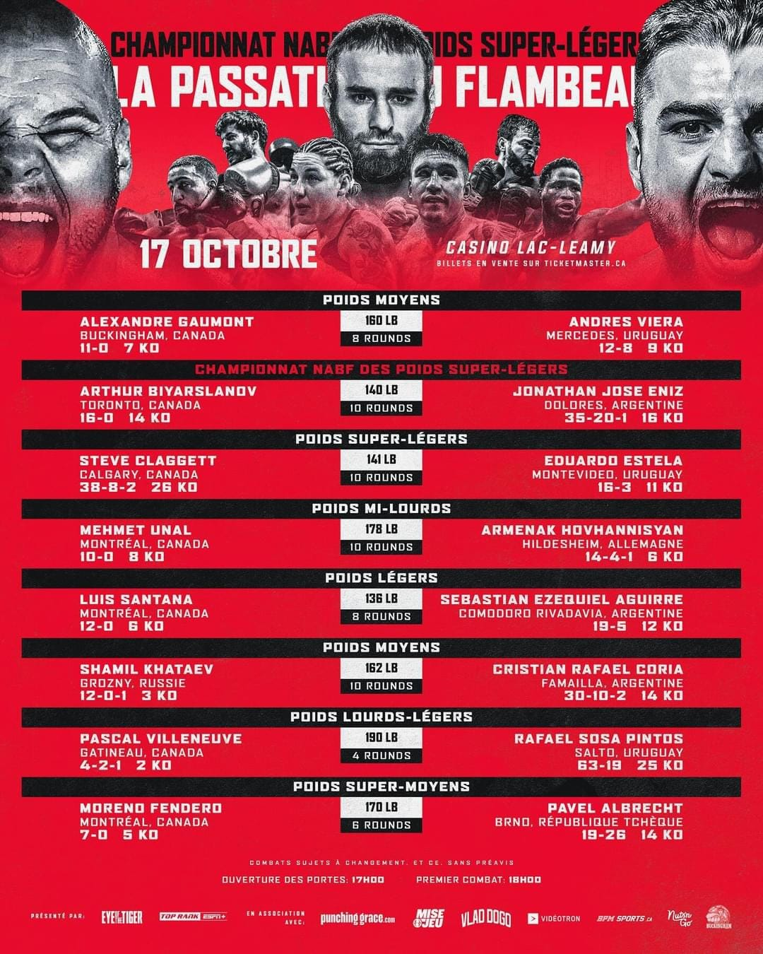 Hay otros argetinos que pelearán en la noche de hoy y compartirán cartelera: Juan José Velasco en mediano peleará con el invicto ruso Shamil Khataev; Jonathan Eniz enfrentará a Movladdin Biyarslanov (Rusia); el supermediano Cristian Zárate chocará con el local e invicto Alexandre Gaumont y el bonaerense Roberto Dionisio Moreno (con paso por Comodoro Rivadavia) peleará a 4 rounds en peso crucero con Pascal Villeneuve.