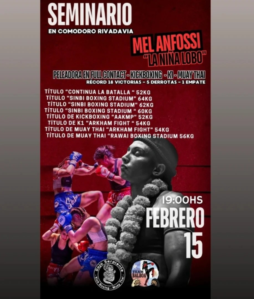 Una de las mejores exponentes del país en Muay thai, k1 y Kick boxing llega a Comodoro con un seminario (abierto a todas las escuelas de Comodoro y alrededores) Alumna directa del campeón mundial Cristian Bosch.