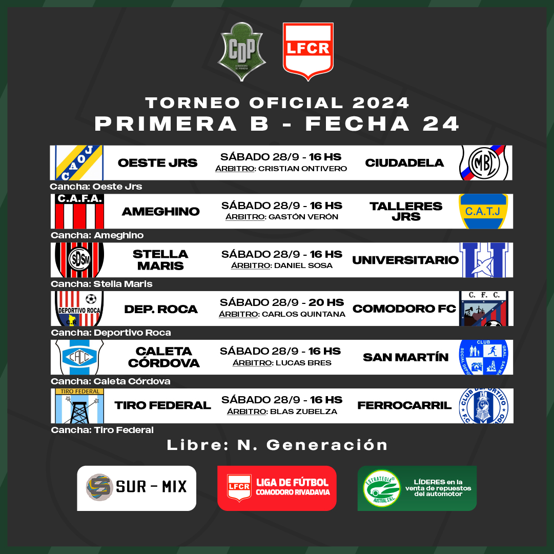 Este sábado 27 de septiembre se jugará la fecha 24 de la Primera “B” del fútbol comodorense, todos los partidos serán a las 16 hs a excepción de Deportivo Roca – Comodoro Fc que se jugará a las 20 hs. Ameghino en caso de ganar podría salir campeón.