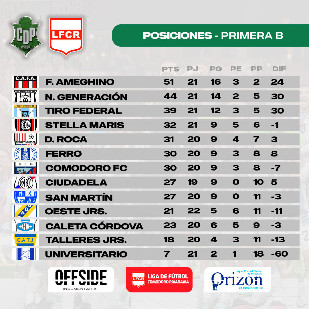 Este sábado se jugarán los 6 partidos de la «B» comodorense con la particularidad de que si Ameghino, que jugará de local, le gana a Talleres Jrs; saldrá campeón junto a su gente.