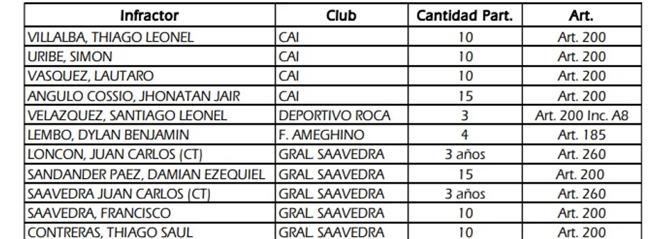 En el Parque hubo sanciones para tres jugadores, también bajo el artículo 200. Francisco Saavedra y Thiago Saúl Contreras fueron penalizados con 10 cotejos, mientras que Damián Ezequiel Sandander Páez lo fue con 15 partidos.