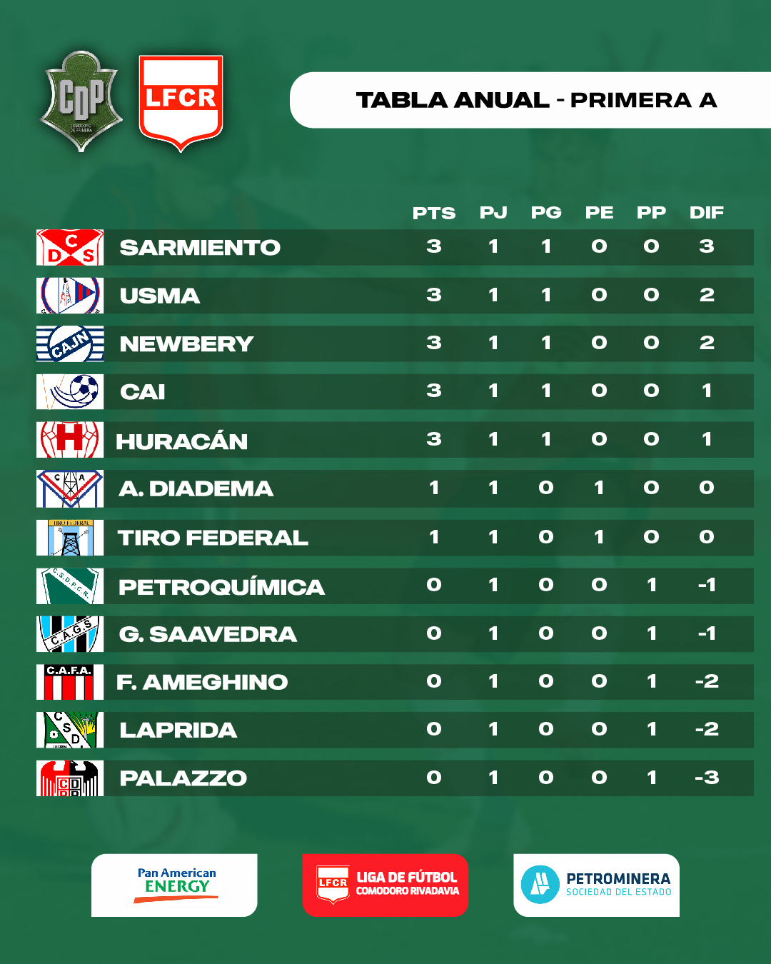 La única victoria de local se dio en en el Pampa Zaldúa de Sarmiento, el ‘Depo’ goleó 3-0 a Próspero Palazzo, el último subcampeón del fútbol comodorense mostró un sólido arranque. Los goles fueron de Rafael Albistur, Lautaro Fanjul y Ezequiel Urbina