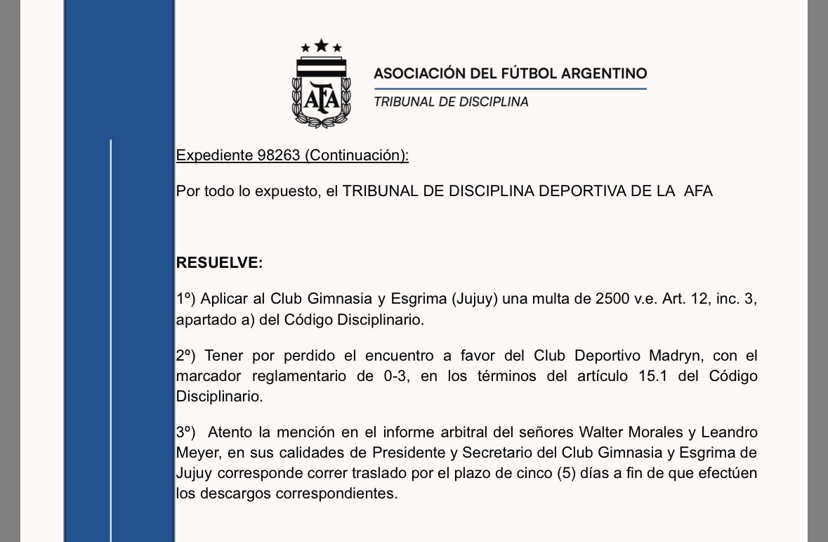 Debido a la suspensión, el Tribunal de Disciplina de AFA abrió un expediente sobre los hechos ocurridos en Jujuy y en la tarde de ayer se dio a conocer el veredicto. El mismo indica la finalización del encuentro, con un resultado de 3-0 a favor de Deportivo Madryn. Además, se programó el partido de vuelta para el domingo 2 de noviembre a las 16 horas, en Puerto Madryn.