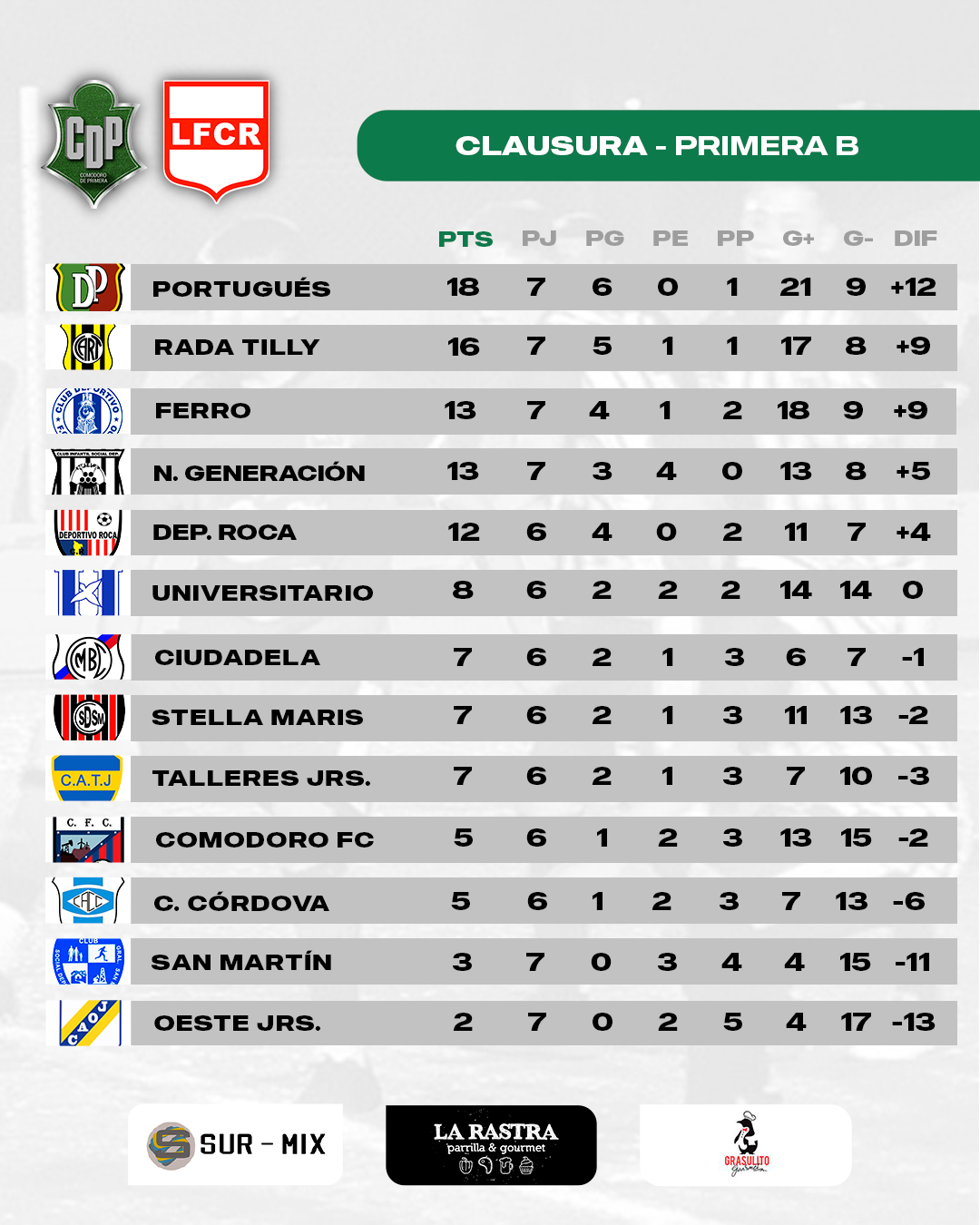 La fecha 7 del Clausura de Primera B se jugó en su totalidad el sábado, con seis encuentros en simultáneo, y dejó un nuevo puntero del torneo. El Lusitano aprovechó la caída de Rada Tilly y llegó a lo más alto con su triunfo sobre Roca.