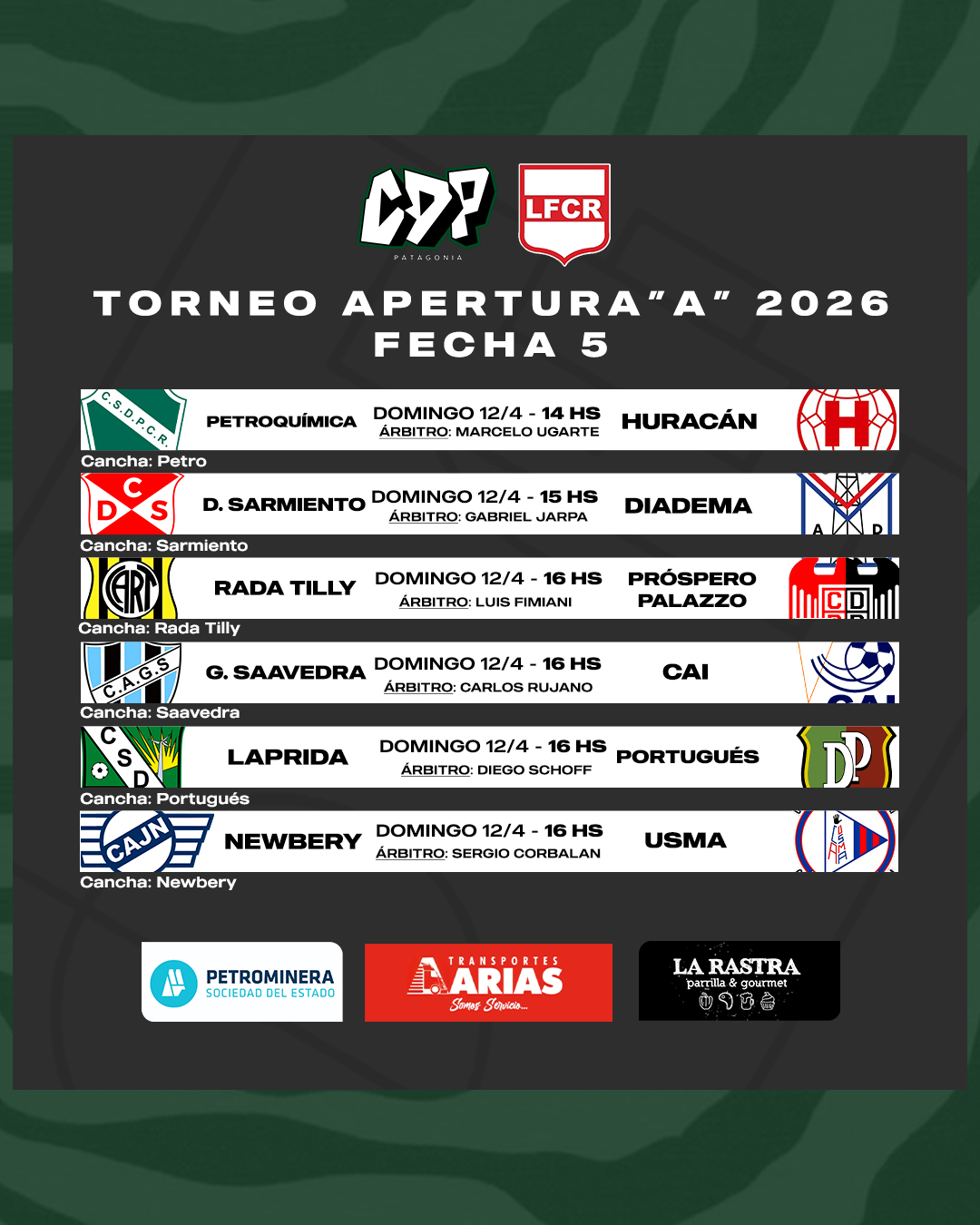 Rada Tilly se mide a Próspero Palazzo, arbitrado por Luis Fimiani. Presentes opuestos entre ambos clubes, con el Aurinegro victorioso en sus últimos dos partidos y el Aguilucho cayendo en las últimas dos fechas.