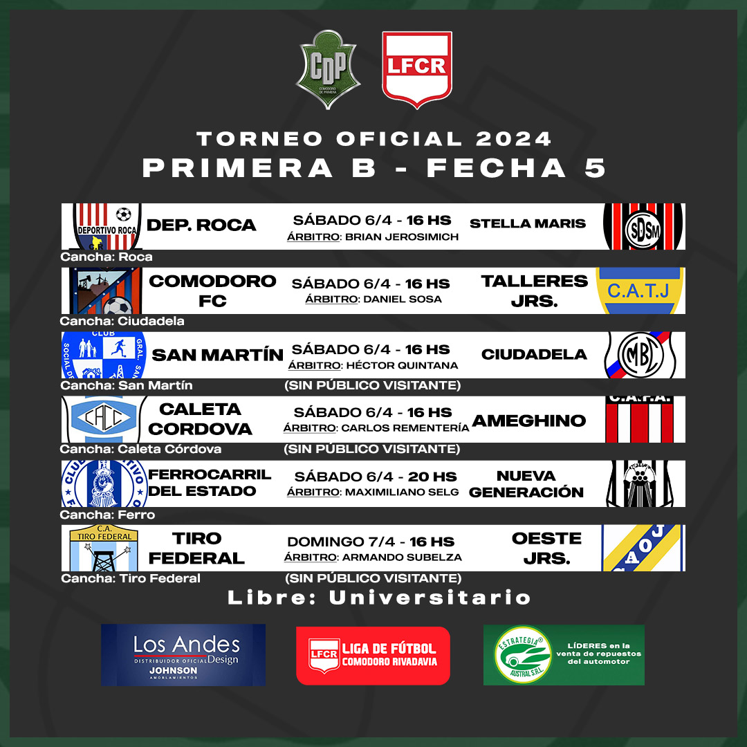 Con un horario estipulado para las 16 horas, como viene pasando últimamente, con un sólo encuentro en horario nocturno para esta ocasión, así se jugará la fecha 5: