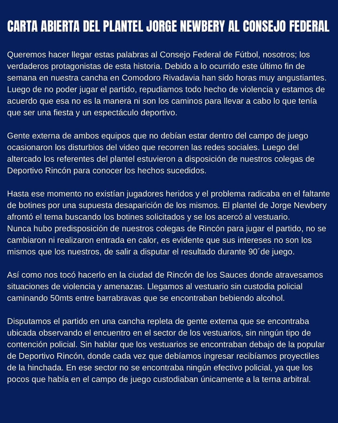Por eso, el club comodorense hizo un comunicado lamentando lo sucedido y brindando explicaciones.