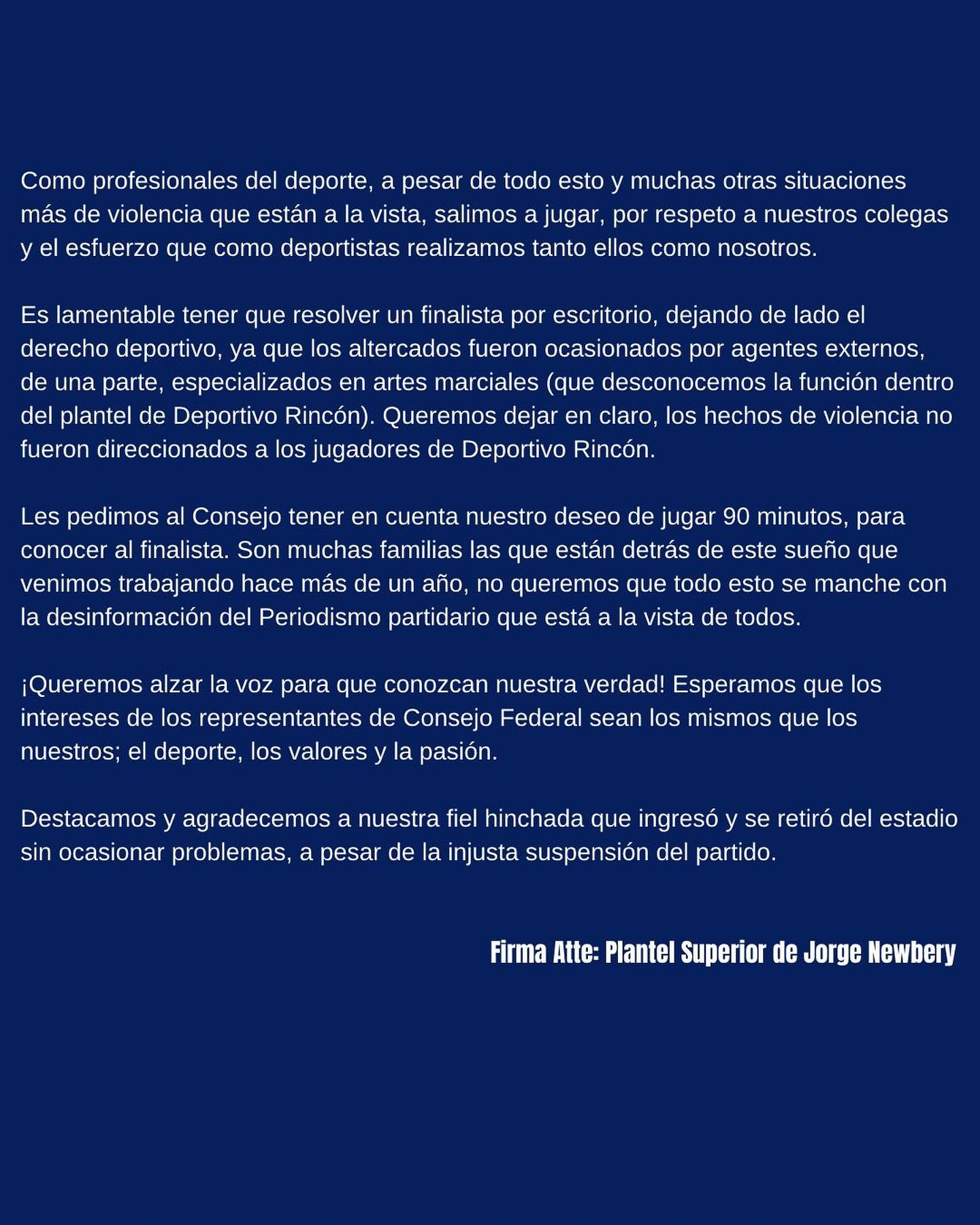 Este martes 6 de febrero, en teoría, se hace pública la resolución sobre la final entre Jorge Newbery y Deportivo Rincón, cuyo partido de vuelta no pudo desarrollarse por los incidentes de público conocimiento.