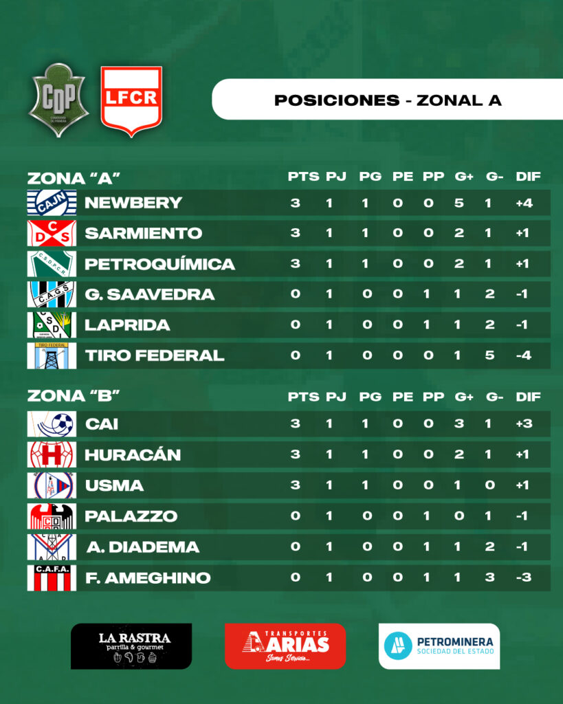 Petroquímica debutó con victoria 2-1 sobre Laprida. Los goles de Petro fueron obra de Jorge Lasso y Benjamín Pedrosa, para el visitante anotó Santiago Díaz. El Verdolaga acumula siete presentaciones sin conocer la derrota, mientras que el Verde volvió a caer tras dos cotejos.