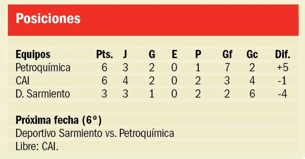 En este caso, por la igualdad de puntos se definiría por la diferencia de goles, donde Petroquímica tiene más a su favor, la situación está entre CAI y Sarmiento, los dirigidos por el «Chaca» Bustos necesitan ganar sí o sí por tres goles o más ante Petroquímica.