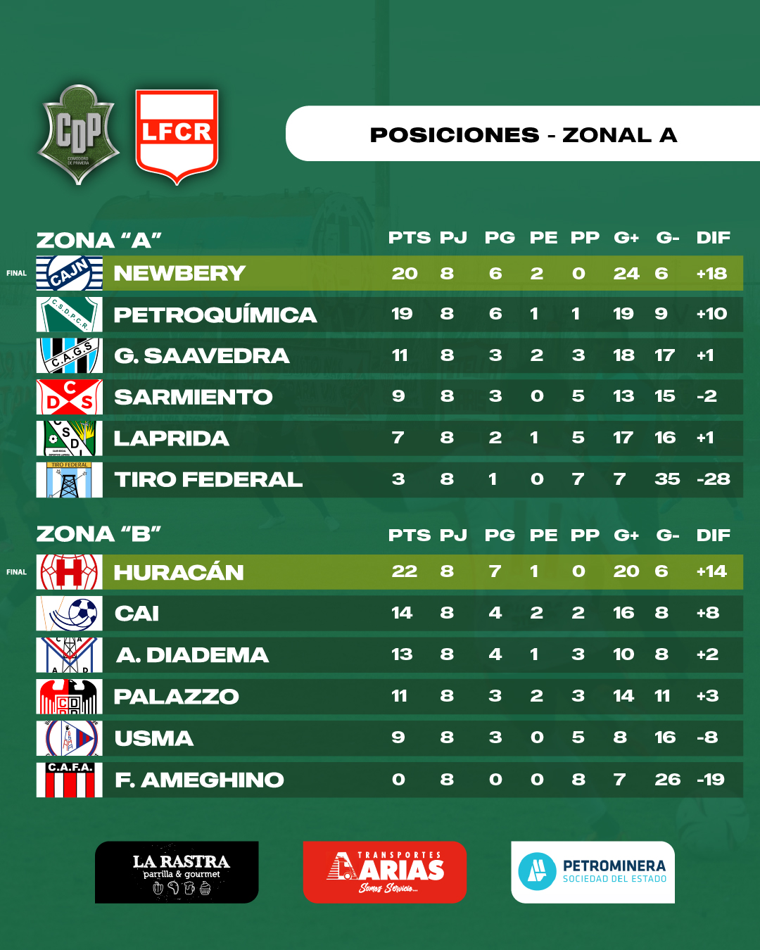 Desde las 16 hs habrá tres cotejos más. En el Far West, Laprida y Jorge Newbery se miden bajo el arbitraje de Diego Bayón. El Verde suma solo dos triunfos en el certamen y está anteúltimo en su zona. Por su parte, el Lobo corre riesgo de perder los puntos de su triunfo ante Petroquímica y volver a caer al segundo lugar.