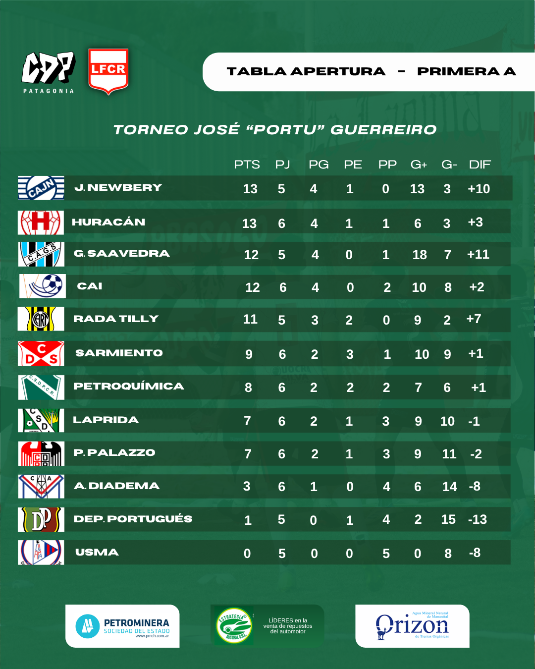 La fecha se completará entre semana con la disputa de General Saavedra vs. Jorge Newbery y USMA vs. Rada Tilly. Entretanto, así está la clasificación: