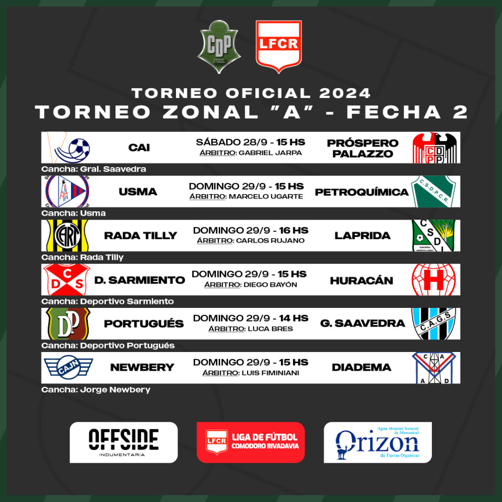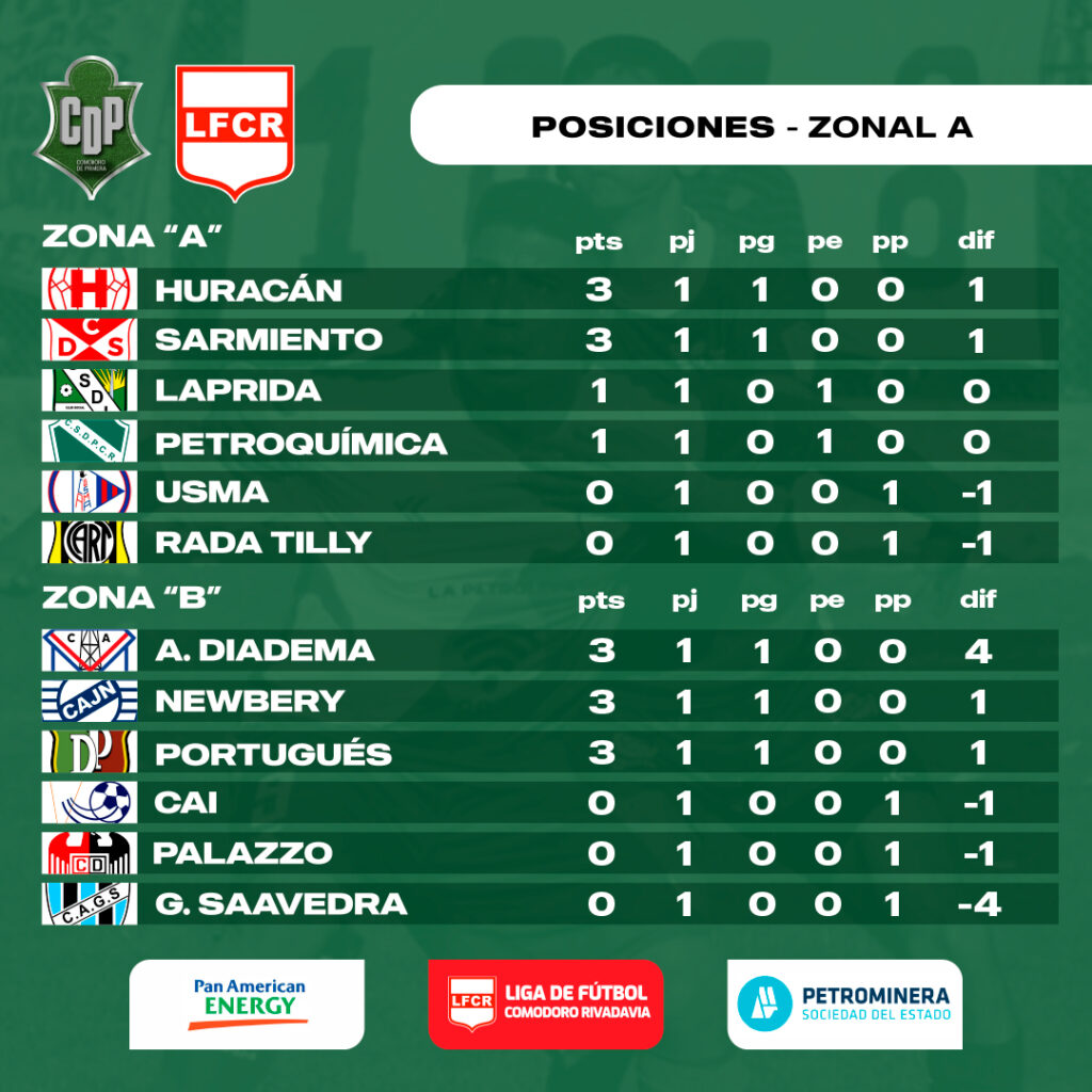 En la zona “A”, a las 15, se enfrentarán dos que debutaron ganando: Deportivo Sarmiento y Huracán, que superaron a Unión San Martín Azcuénaga y Rada Tilly, respectivamente. Diego Bayón será el árbitro.