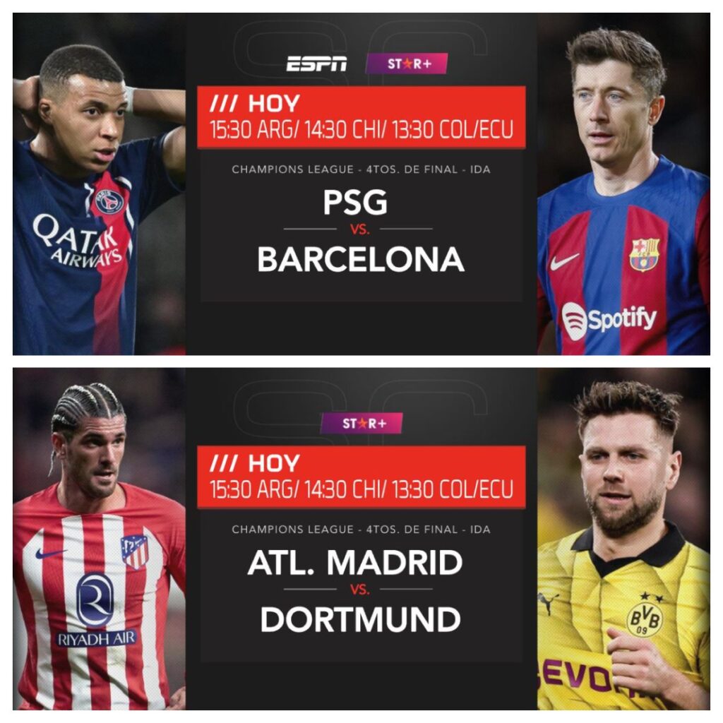 Hoy se disputa la otra llave donde juegan el PSG de Mbappe vs el Barcelona de Lewandowski. Por otro lado, el Atlético de Madrid del Cholo Simeone juega contra el Borussia Dortmund.