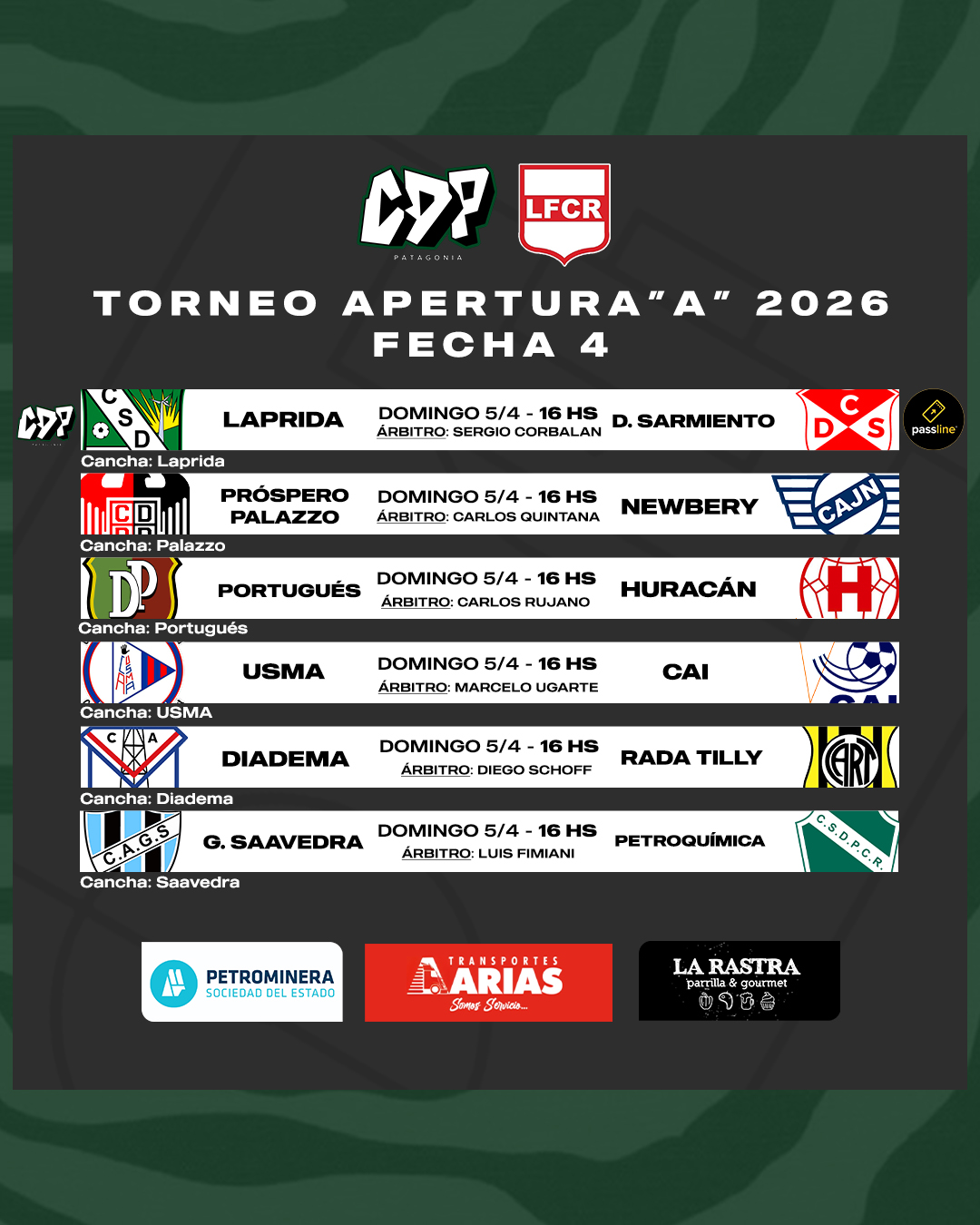 Laprida recibe a Deportivo Sarmiento con el arbitraje de Sergio Corbalán. En el Far West, el Verde busca sus primeros puntos en el certamen, mientras que el Depo goleó la fecha pasada y se ubica quinto. El encuentro será transmitido en vivo por CDP, a través de Passline.