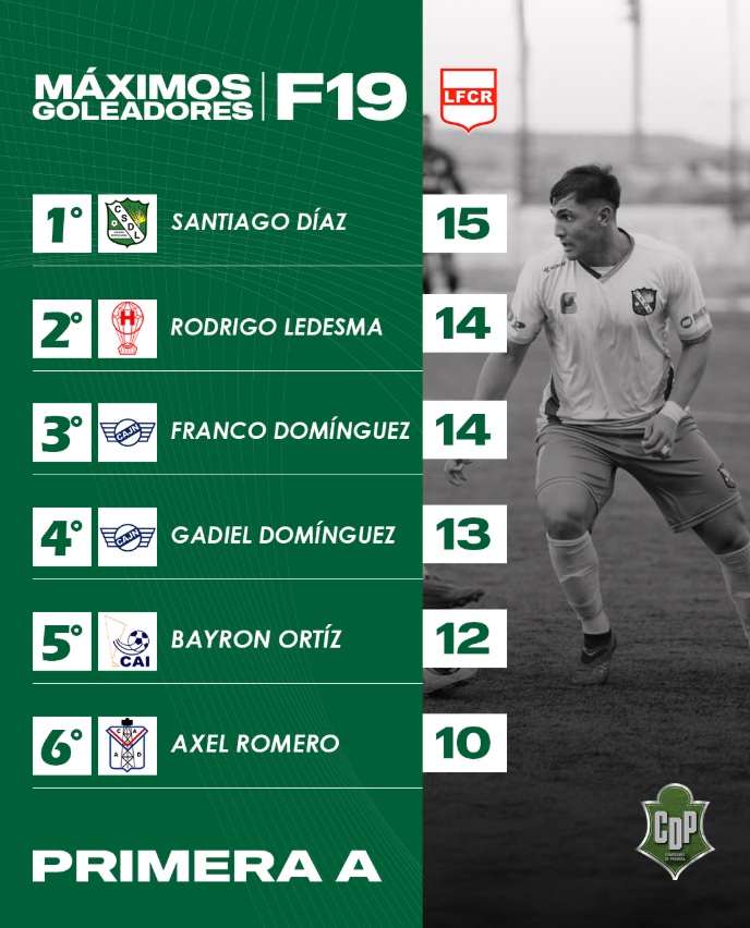 En la Primera A, el torneo tiene a CAI como único líder, pero la tabla de artilleros muestra otra batalla. Santiago Díaz (Laprida) sigue en lo más alto con 15 tantos. A un paso, con 14, aparecen Franco Domínguez (Newbery) y Rodrigo Ledesma (Huracán). Un poco más atrás, Gadiel Domínguez (Newbery) suma 13, mientras que el delantero del puntero, Bayron Ortíz (CAI), acumula 12. El sexto lugar lo ocupa Axel Romero (Diadema) con 10 goles.