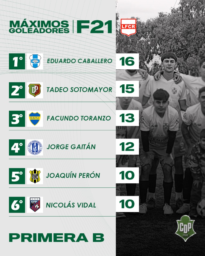 En la Primera B, el líder del campeonato es Rada Tilly, que buscará cerrar fuerte las últimas cinco fechas pero en la de goleadores manda Eduardo Caballero (C. Córdova) encabeza la lista con 16 conquistas, aunque Tadeo Sotomayor (Deportivo Portugués) lo sigue de cerca con 15 y Facundo Toranzo, quien ya no juega en el futbol comodorense, dejó su marca con 13 goles. Más atrás aparecen Jorge «Coco» Gaitán (Ferrocarril) con 12, y con 10 goles cada uno están Joaquín Perón (Rada Tilly) y Nicolás Vidal (Comodoro FC).