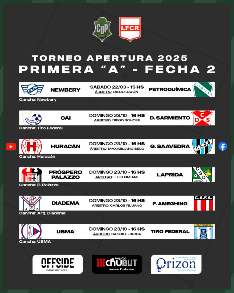 El domingo, la jornada estará cargada de emociones con seis encuentros programados para las 16:00 hs. En la cancha de Tiro Federal, CAI hará de local y se medirá ante Deportivo Sarmiento, con Diego Schoff como juez principal. CAI viene de ganar sobre el final ante Saavedra, mientras que el Depo goleó en Sarmiento a Palazzo.