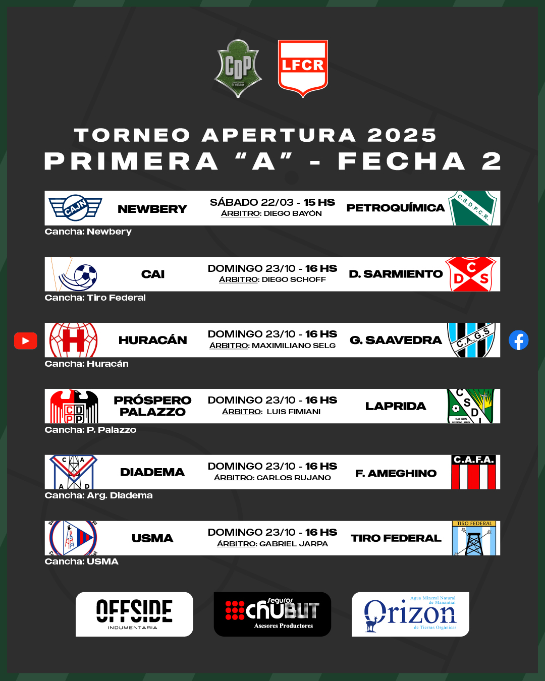 En otro de los encuentros, Próspero Palazzo recibirá a Laprida en un duelo que será dirigido por Luis Fimiani, acompañado de Guillermo Díaz y Carlos Quintana. El «Aguilucho» perdió en la primera fecha en su visita a Sarmiento y el «Far West» perdió de local frente a USMA.