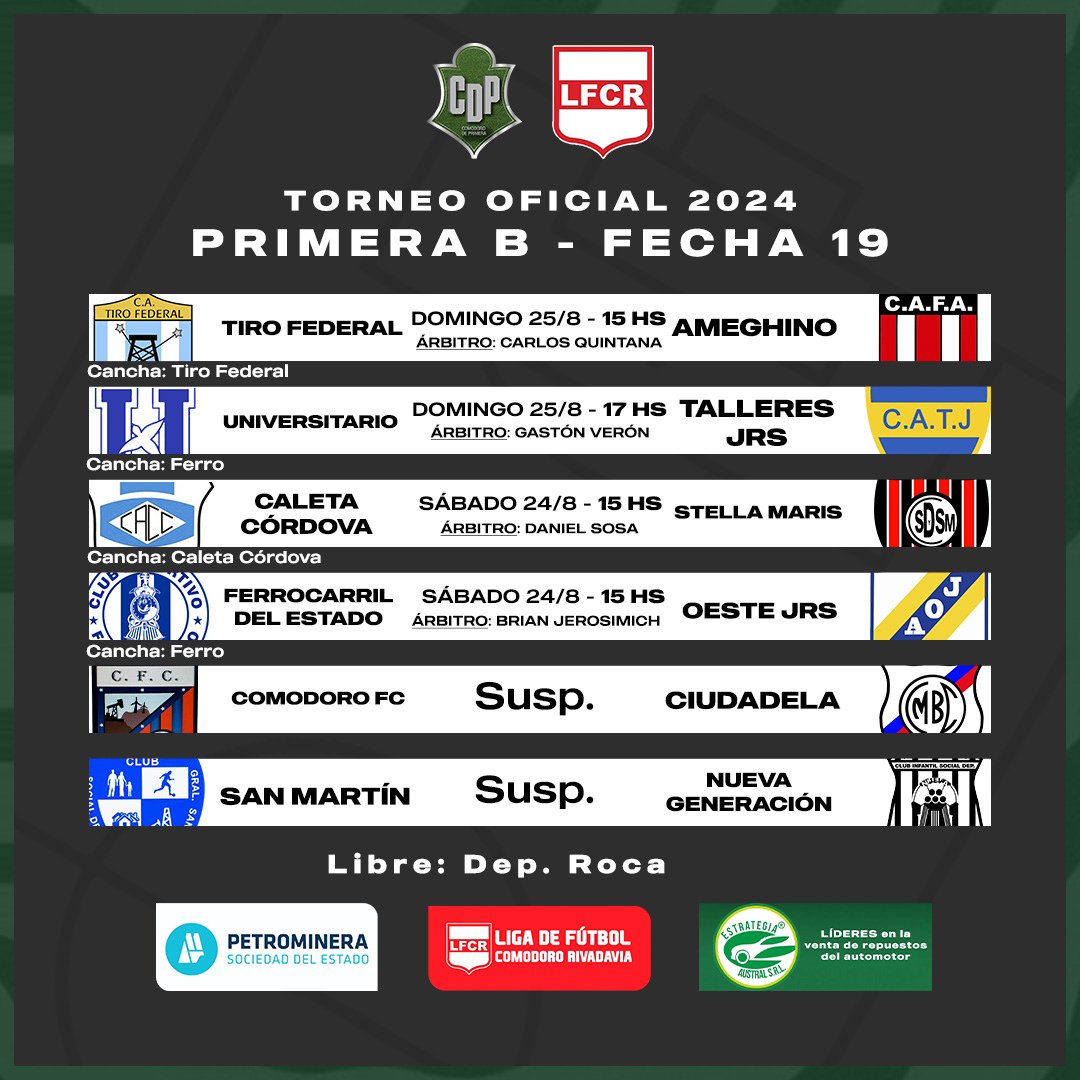 Y a las 17 horas, se presentan en cancha de Ferro, Universitario contra Talleres Juniors para completar con esta fecha 19 que tiene dos encuentros suspendidos por mal estado de los campos de juego que son San Martín-Nueva Generación y Comodoro FC-Ciudadela.