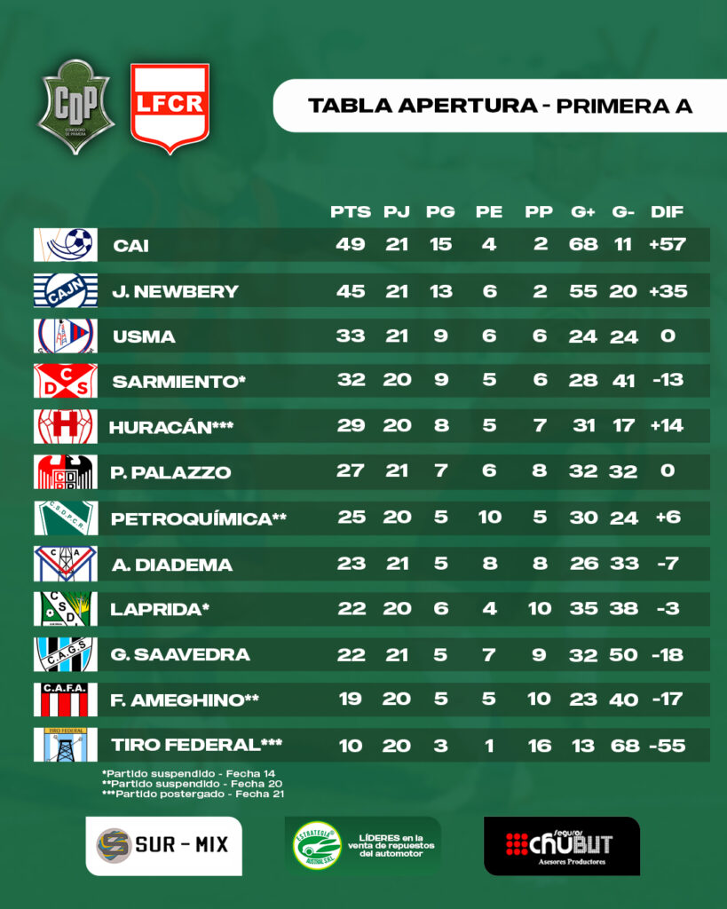 Vale recordar que, en la jornada del sábado, Gral. Saavedra venció 3-1 a Florentino Ameghino y Arg. Diadema goleó 3-0 a Deportivo Sarmiento. Además, el duelo entre Huracán y Tiro Federal fue postergado y se jugaría, en principio, el próximo fin de semana.