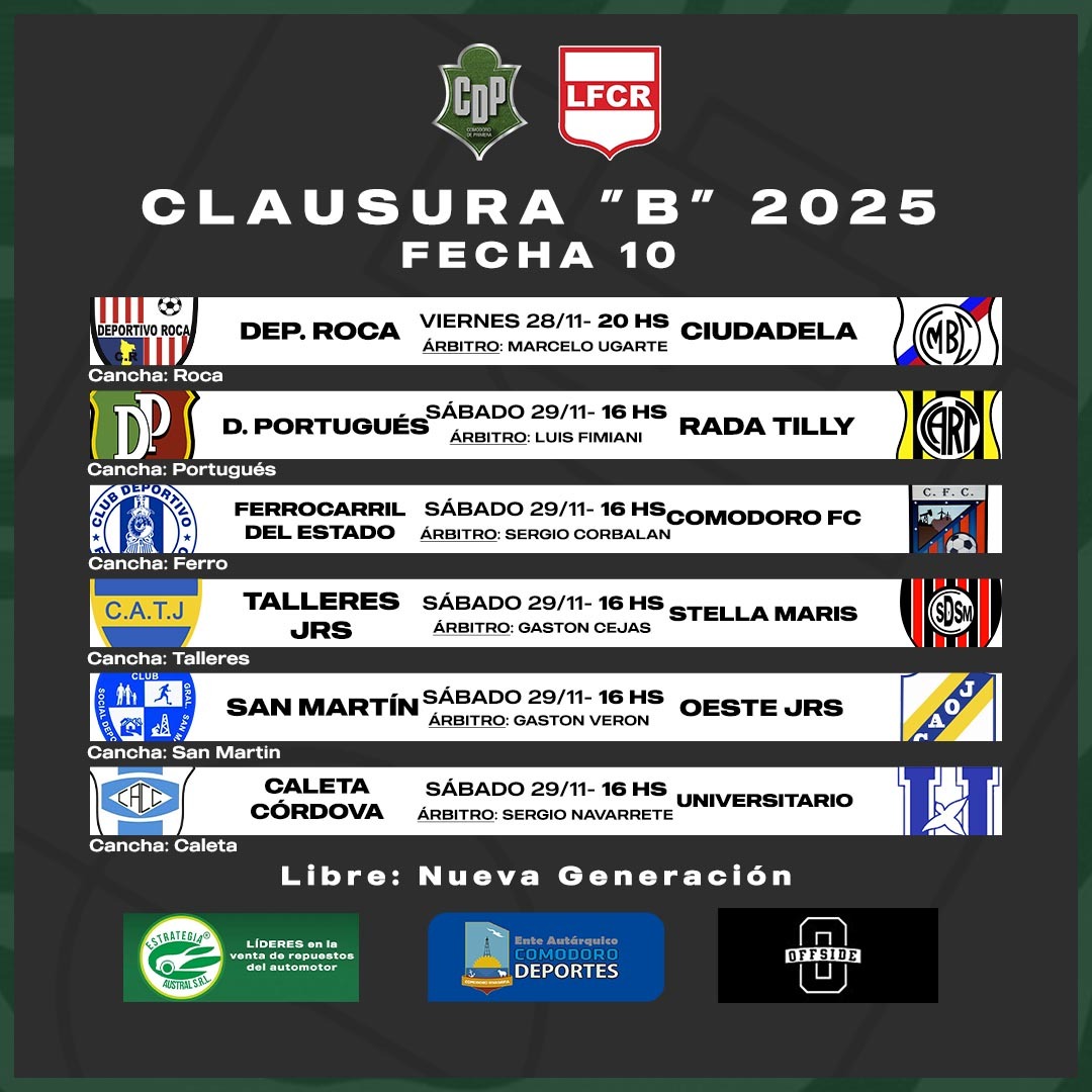 El resto de la fecha se jugará el sábado a las 16 hs. En el encuentro de la fecha, y posiblemente del campeonato, Deportivo Portugués y Rada Tilly se enfrentan en el Inmigrantes Portugueses. Luis Fimiani será el encargado de impartir justicia.