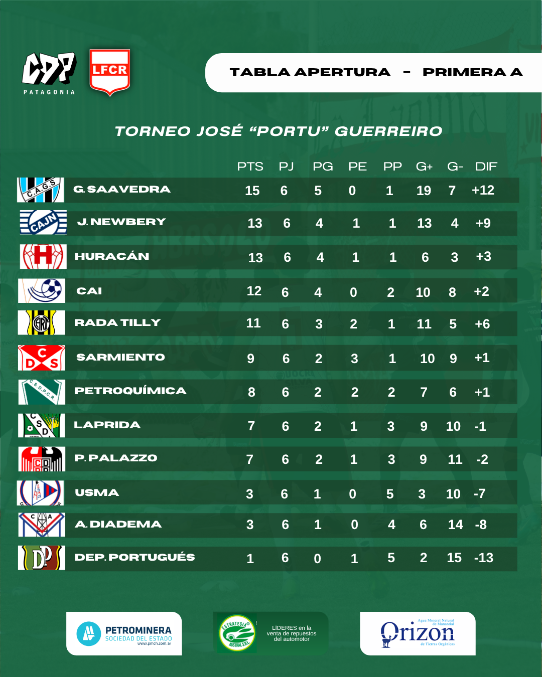 La sexta fecha del Apertura de Primera A se completó en la tarde de hoy, con la disputa de los dos encuentros que habían quedado pendientes por el Clasificatorio Patagónico.