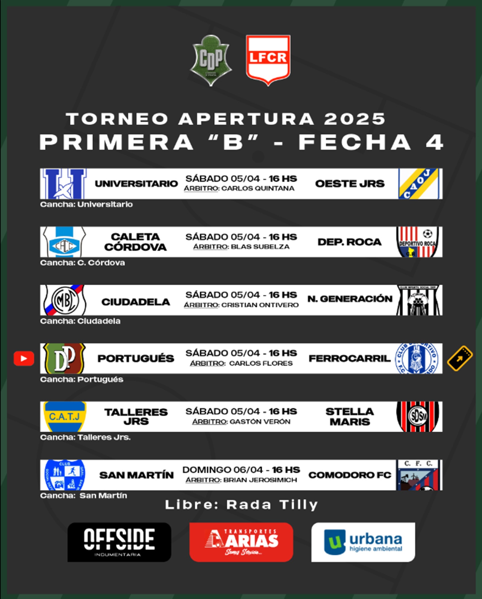 Talleres Jrs, que logró su primera victoria la fecha pasada, juega de local contra Stella Maris, aún sin ganar, Gastón Verón será el juez principal. Mientras que Roca y Caleta Córdova se miden buscando acercarse a los líderes, bajo el arbitraje de Blas Subelza.