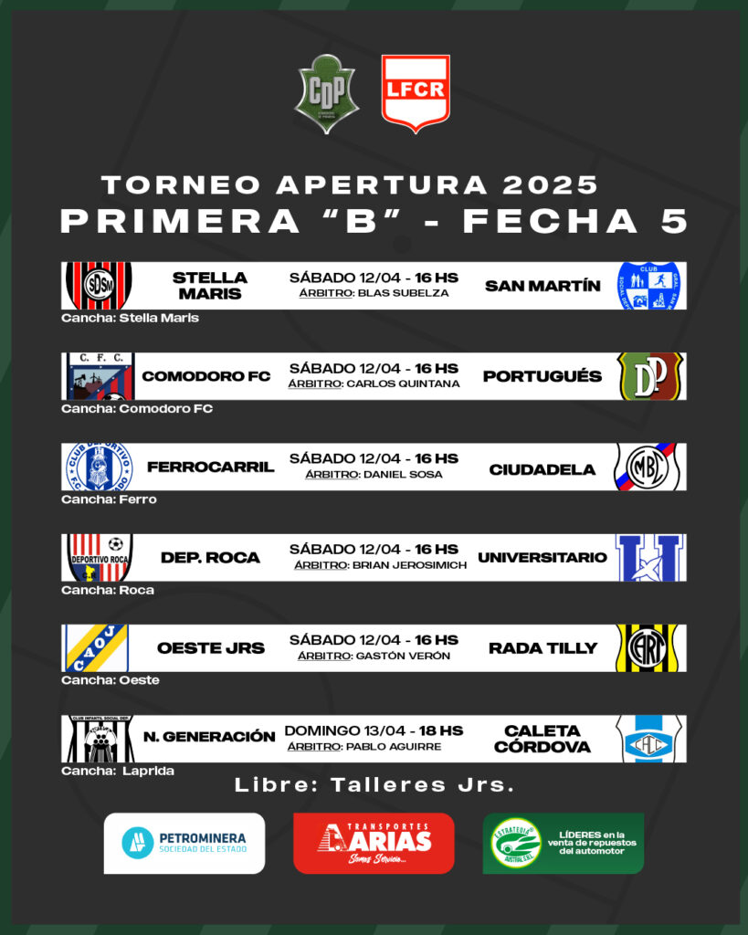 En uno de los partidos centrales, Oeste Jrs hará de local ante Rada Tilly. El local, que viene de golear a Universitario, suma 7 puntos, ubicándose en tercer lugar. Por su parte, el Aurinegro no jugó la fecha pasada y es escolta, con 9 puntos. Gastón Verón será el juez del encuentro.