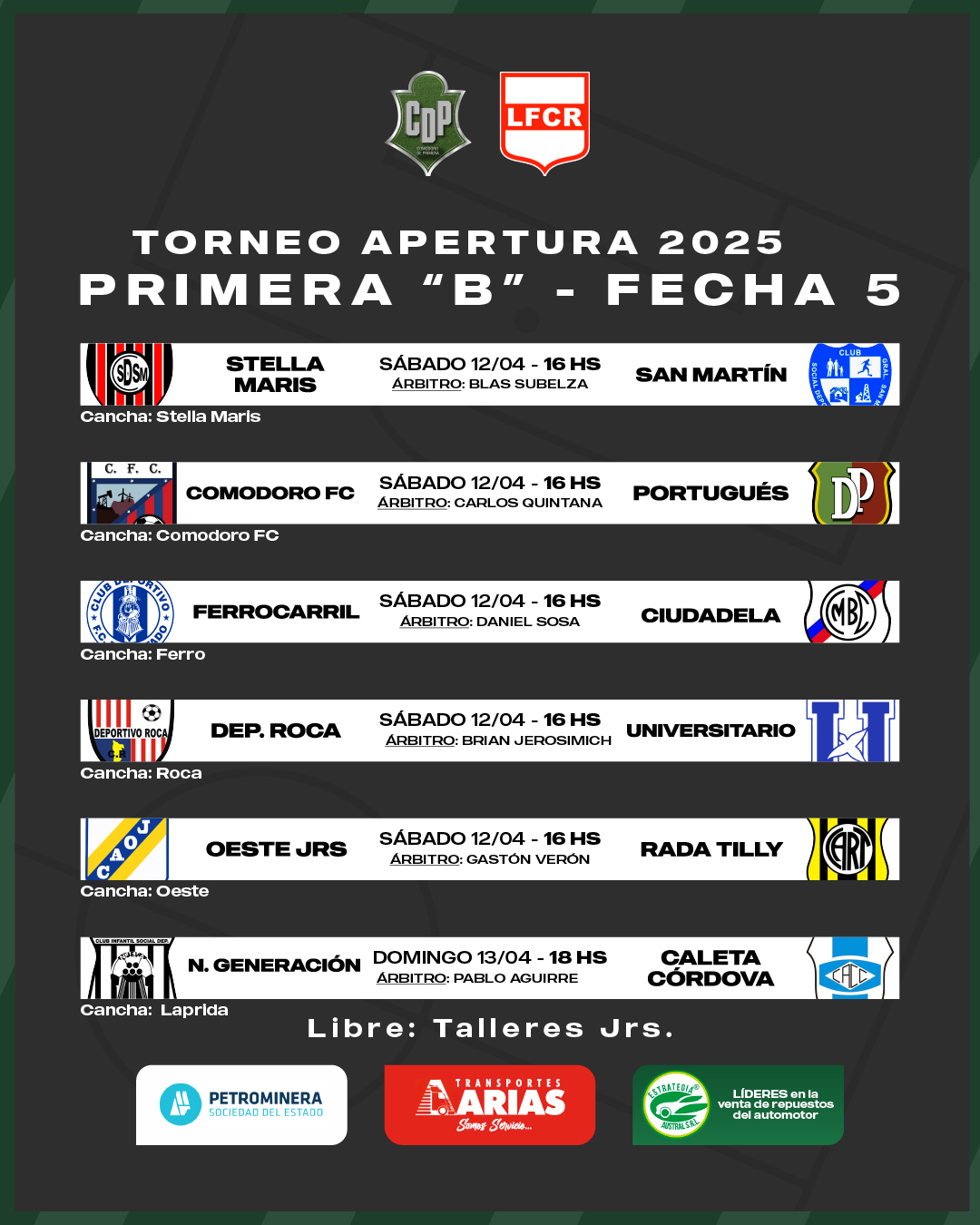 Un Universitario necesitado visita a Deportivo Roca, otro escolta con 9 puntos, buscando sus primeros puntos. Brian Jerosimich será el referí. Stella Maris y San Martín buscarán sus primeras victorias cuando se midan entre ellos, ambos se encuentran con un punto. Blas Subelza arbitrará el partido.