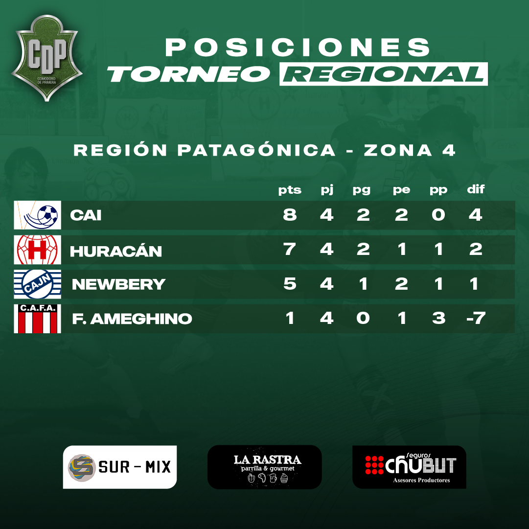 Finalizada la fecha 4 del grupo patagónico de la zona 4, el Aeronauta venció por 3-1 en un partidazo a Huracán en la Madriguera Antes del clásico Ameghino y la CAI jugaron en el Estadio Municipal donde el Azzurro salió victorioso del encuentro por 2-0.