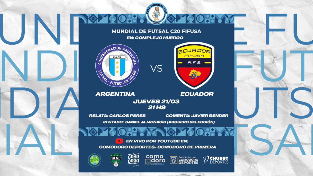 Argentina juega hoy con Ecuador, a quien le gano en la primera vuelta 10-0 y quiere pasar a la final. En la otra semifinal Brasil y Colombia definen quien será el finalista del Mundial de Futsal C-20. Cerca de las 18 horas, comienza la transmisión de Comodoro De Primera, con dos partido de alto voltaje.