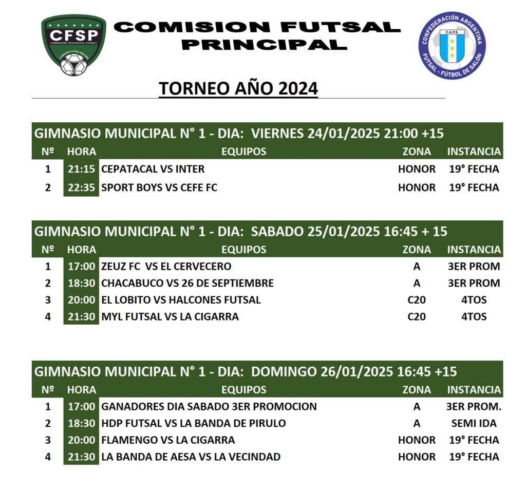 El día de hoy el futsal abrirá el fin de semana con los dos encuentros de la categoría Honor del torneo oficial 2024. Los partidos correspondientes a la 19ª fecha de la fase regular serán disputados en el Gimnasio Municipal 1 a partir de las 21:15.