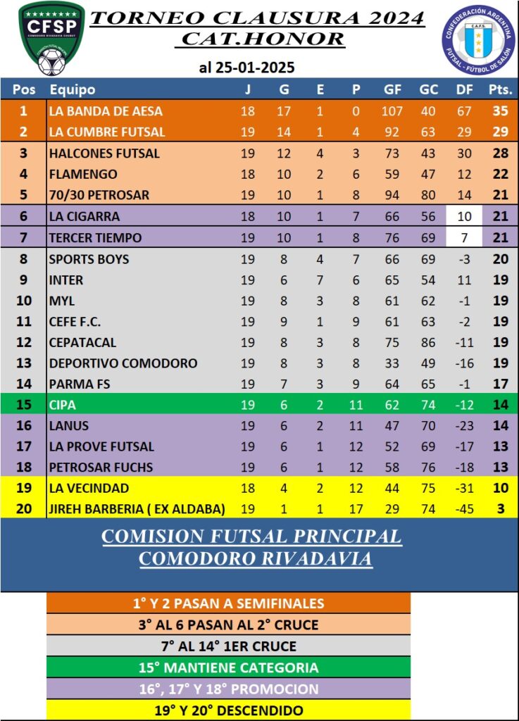 TABLA DE POSICIONES – CATEGORÍA HONOR