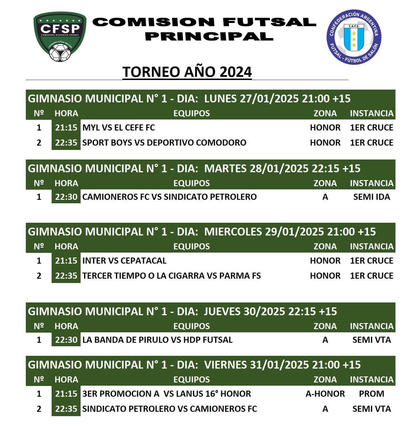 El día de hoy el futsal abrirá la semana con los dos encuentros de la categoría Honor del torneo oficial 2024. Los partidos correspondientes al primer cruce serán disputados en el Gimnasio Municipal 1 a partir de las 21:15.
