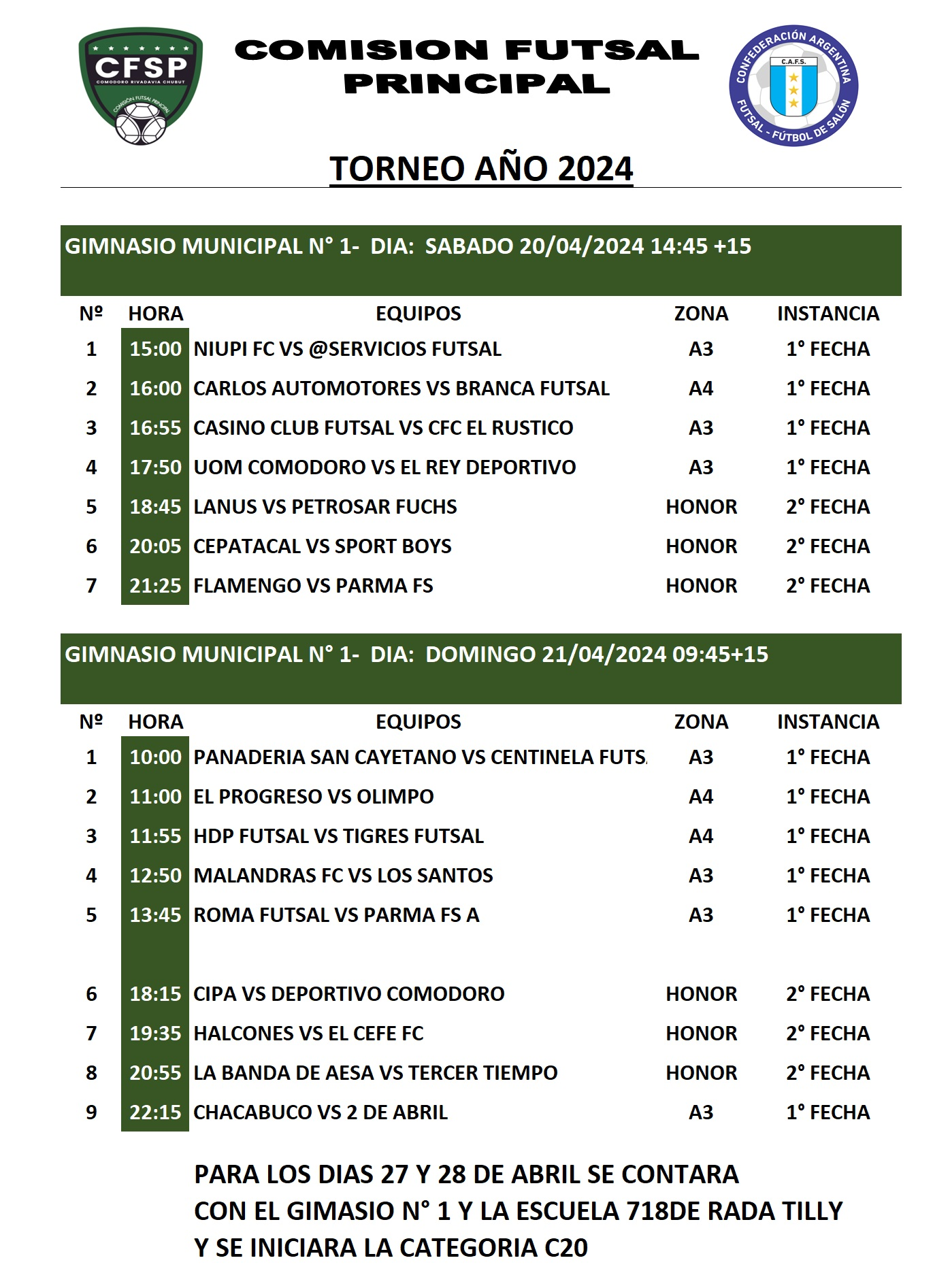 Las categorías que estarán son las de Honor y también el ascenso con la zona A3 Y A4. En Rada Tilly, en la escuela N° 718 se llevará a cabo la categoría C20, quien tuvo mucho reconocimiento luego del paso del Mundial que ganó Argentina en Comodoro Rivadavia.