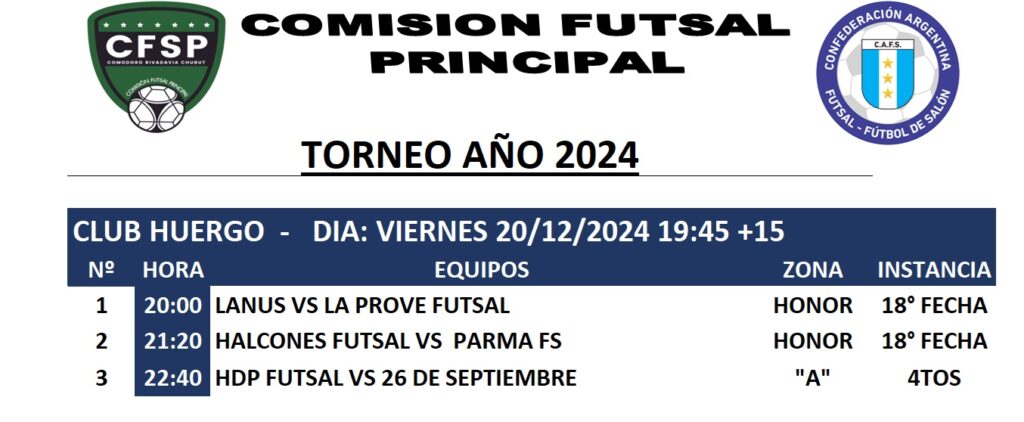 - HDP FUTSAL 6: DIAZ GERMAN 2- MANSILLA GABRIEL 4