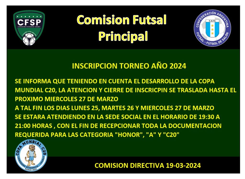 La inscripción y entrega de documentación de las categorías «Honor», «A» y C-20 para el torneo 2024 de futsal principal comodoro se podrá entregar hasta el 27 de marzo.