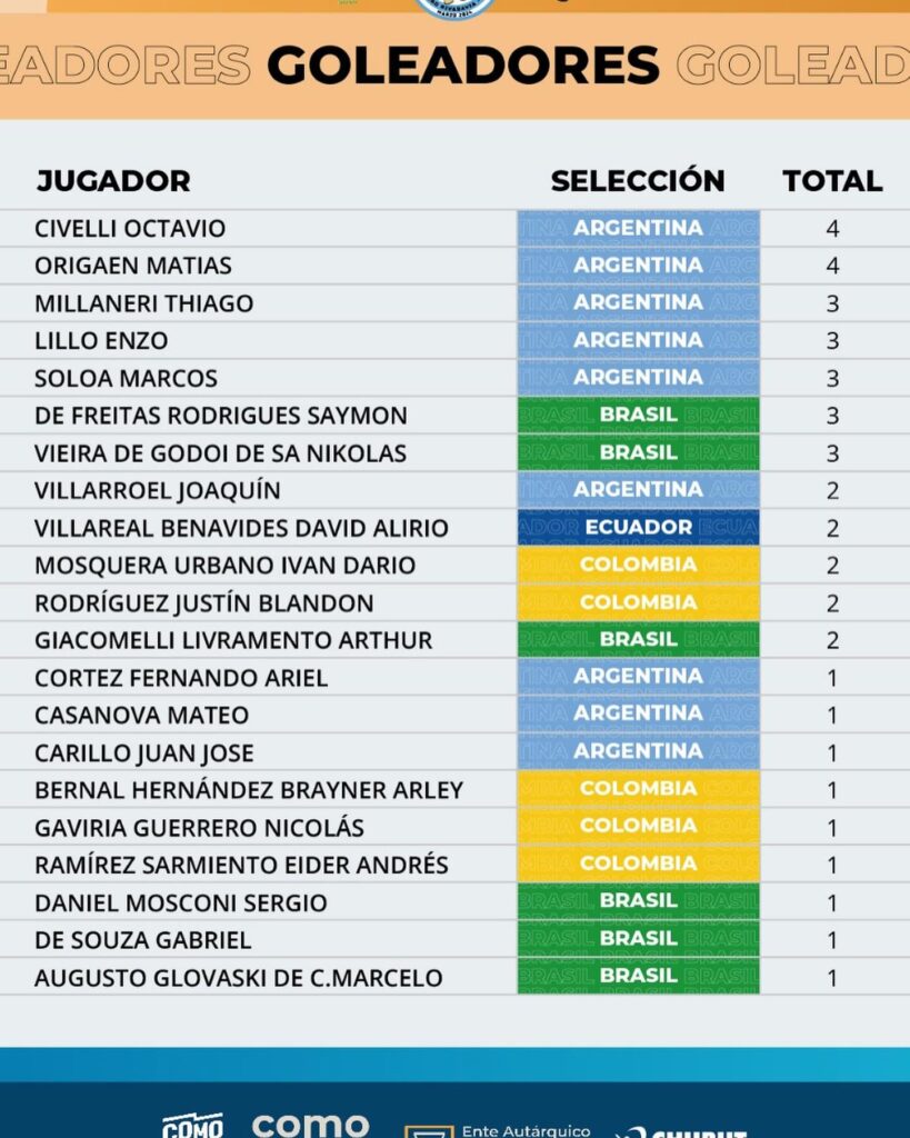 Octavio Civelli y Matías Origaen de la selección Argentina lideran la tabla de goleadores con 4 goles.