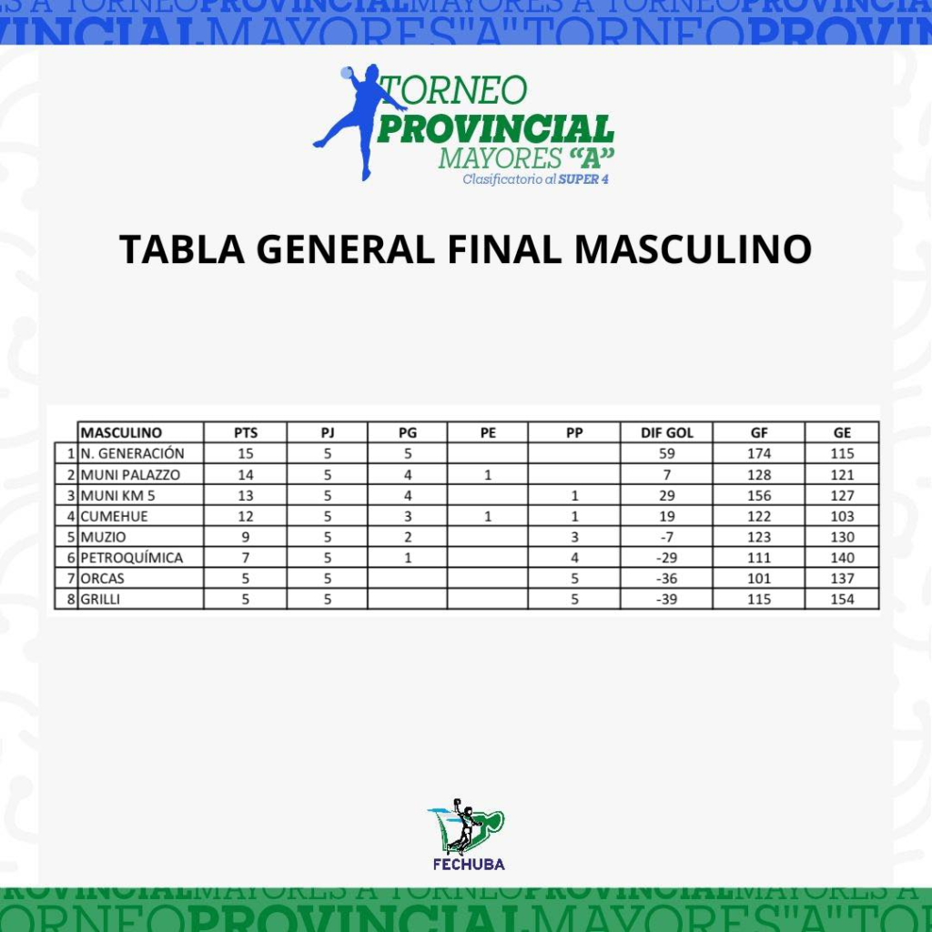 En el gimnasio Municipal Nº 2 y en la Escuela Nº 722, hubo una jornada intensa de handball provincial donde se confirmaron los clasificados, tanto en hombres como en mujeres. Así quedó la tabla general de los equipos masculinos con los clasificados al Súper 4 que se jugará en noviembre en Comodoro