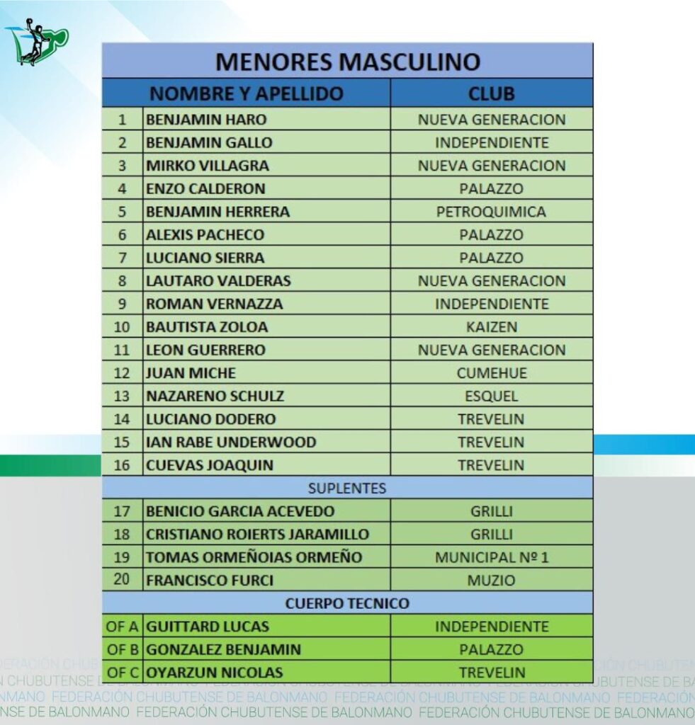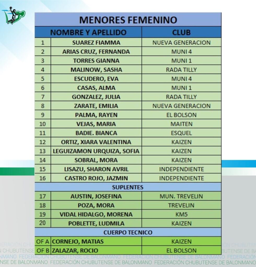 Los cuerpos técnicos de las selecciones menores mujeres y varones, confirmaron el listado oficial de las selecciones de Chubut (Fe.Chu.Ba), que participarán del Argentino de Selecciones del 10 al 14 de junio en la ciudad de Bariloche.
