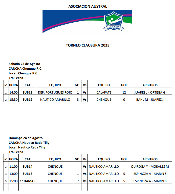 El sábado abrió la fecha en las instalaciones de Chenque RC, con dos partidos de Sub 19. Calafate venció 12-1 a Dep. Portugués Rojo, mientras que Náutico Amarrillo derrotó a Chenque RC por 3-0.