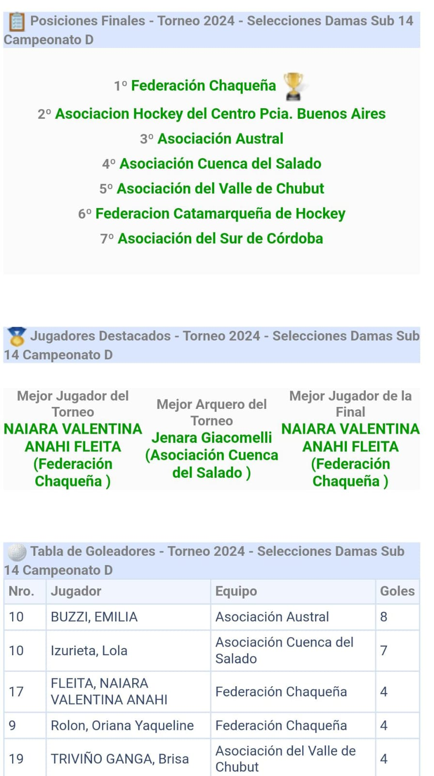 En Catamarca se realizó Torneo Nacional de Selecciones Sub 14 femenino de hockey. Emilia Buzzi de Austral se coronó goleadora del Torneo con 8 goles.