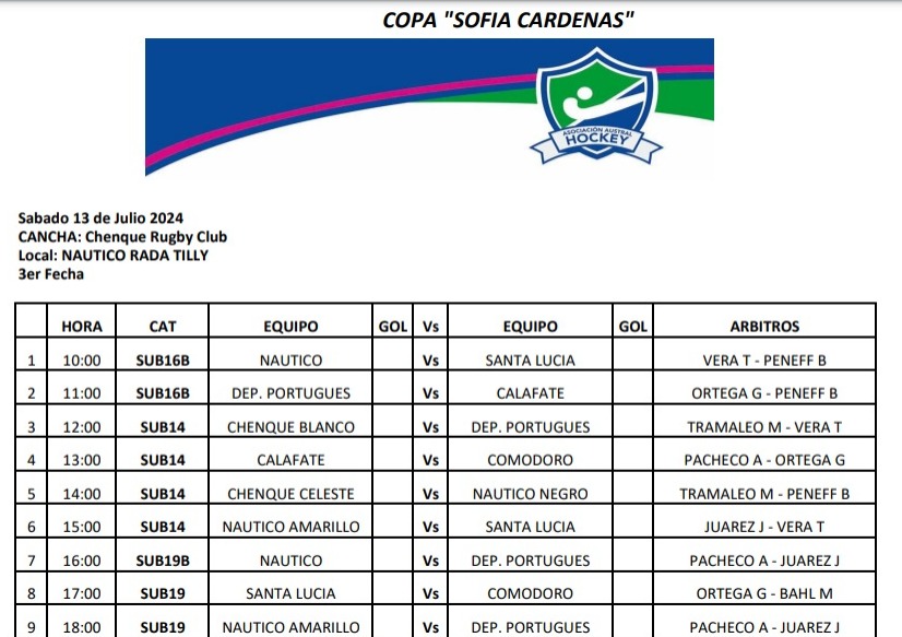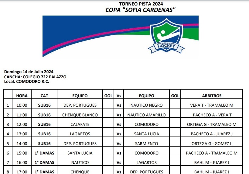 Este fin de semana sigue la acción del Torneo de Hockey Pista, el sábado en instalaciones de Chenque R.C y el día domingo en Colegio 722 del barrio Prospero Palazzo. FIXTURE DEL FIN DE SEMANA: