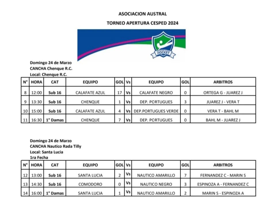Tras la inauguración de la cancha de hockey de Chenque Club una obra que lleva varios meses de trabajo y ya se encuentra en óptimo estado para sumar un nuevo campo de deportes para la actividad y la ciudad de Rada Tilly se desarrolló la primera fecha del torneo. También se realizaron partidos en la cancha de Club Nautico Rada Tilly.